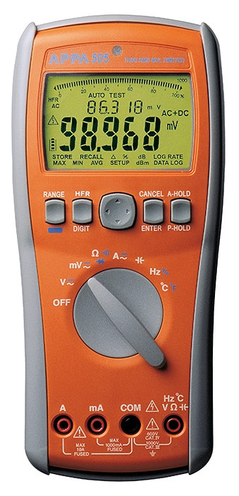 Цифровой мультиметр APPA-503 предназначен для измерения переменного (АС, AC+DC) и постоянного напряжения до 1000В, переменного и постоянного тока до 10А, частоты, скважности, емкости, сопротивления и целостности цепи, температуры, испытания p-n переходов