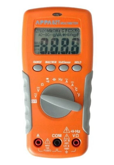 Мультиметр цифровой APPA 62Т (APPA Technology Corporation): Постоянное напряжение 200 мВ - 1000 В; Переменное напряжение 2 мВ - 750 В; Постоянный ток 1 мА - 10 А; Переменный ток 1 мкА - 10 А; Сопротивление 0,1 Ом - 20 МОм; Прозвон цепи; Испытание p-n; Ёмкость 2 нФ - 2 мФ; Частота 2 кГц - 40 МГц; Измерение температуры 20 - 800 °C; Удержание показаний; Регистрация min/max; Автоотключение с блокировкой; Дисплей 3½ (2000); Противоударное исполнение; Бесконтактное определение наличия высокого напряжения.
