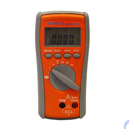 Мультиметр цифровой APPA 75 (APPA Technology Corporation): Постоянное напряжение 400 мВ - 1000 В; Переменное напряжение 400 мВ-750 В; Постоянный ток 400 мкА; Сопротивление 400 Ом-40 МОм; Ёмкость 4 нФ-40 мФ; Испытание p-n; Прозвон цепи и проверка диодов; Удержание показаний; min/max показания; REL измерения; Графическая линейная шкала; Дисплей 4 разряда (4000); Питание 2 х 1,5 В; Автоотключение; Противоударное исполнение (высота до 1,2 м).
