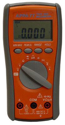 Мультиметр цифровой APPA 77 (APPA Technology Corporation): Постоянное напряжение 400 мВ - 1000 В; Переменное напряжение 400 мВ-750 В; Постоянный ток 400, 4000 мкА, 4, 10 А; Переменный ток 4, 10 А; Сопротивление 400 Ом-40 МОм; Ёмкость 4 нФ-40 мФ; Испытание p-n; Прозвон цепи и проверка диодов; Удержание показаний; min/max показания; REL измерения; Графическая линейная шкала; Дисплей 4 разряда (4000); Питание 9 В; Автоотключение; Противоударное исполнение (высота до 1,2 м). Аналог АРРА 75, дополнительный вход.