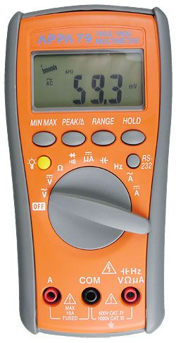 Мультиметр цифровой APPA 79 (APPA Technology Corporation): Постоянное напряжение 400 мВ - 1000 В; Переменное напряжение 400 мВ-750 В; Постоянный ток 400, 4000 мкА, 4, 10 А; Переменный ток 4, 10 А; Сопротивление 400 Ом-40 МОм; Ёмкость 4 нФ-40 мФ; Испытание p-n; Прозвон цепи и проверка диодов; Удержание показаний; min/max показания; REL измерения; Графическая линейная шкала; Дисплей 4 разряда (4000); Питание 9 В; Автоотключение; Противоударное исполнение (высота до 1,2 м); Подсветка дисплея; Оптический интерфейс RS-232.