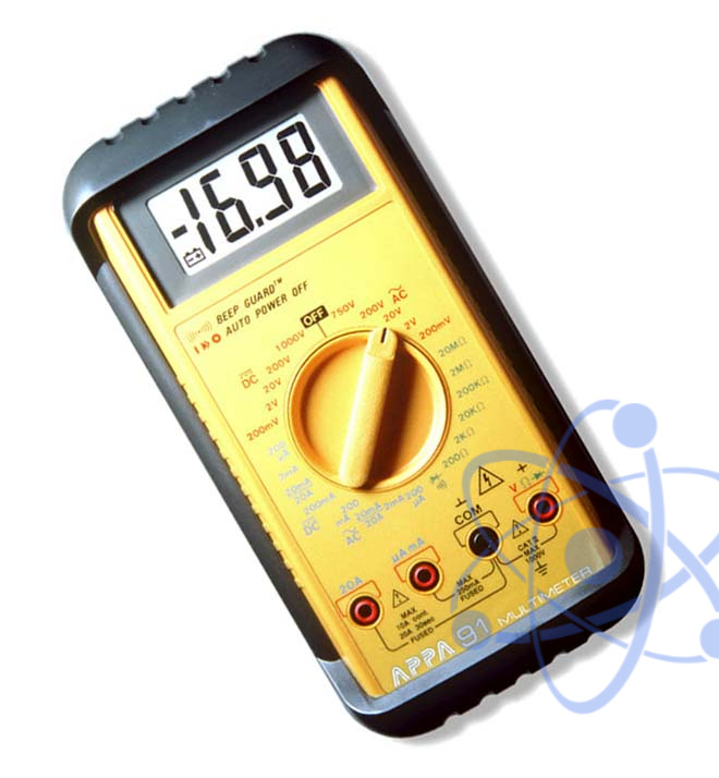 Мультиметр цифровой APPA 91 (APPA Technology Corporation): Постоянное напряжение 200 мВ - 1000 В; Переменное напряжение 200 мВ - 750 В; Постоянный/переменный ток 200 мкА-20 А; Измерение сопротивления 200 Ом - 20 МОм; Удержание показаний; Прозвон цепи; Испытание p-n; BeepGuard; Противоударное исполнение; Использование в любую погоду; Экстра-защита; Цветовая маркировка; Надежный переключатель.