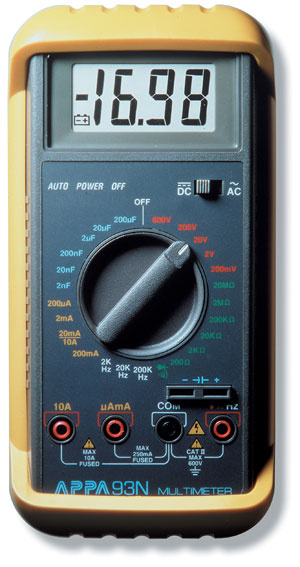 Мультиметр цифровой APPA 93N (APPA Technology Corporation): Постоянное напряжение 200 мВ - 600 В; Переменное напряжение 200 мВ - 600 В; Постоянный/переменный ток 200 мкА-20 А; Измерение сопротивления 200 Ом - 20 МОм; Измерение частоты 2 - 200 кГц; Измерение емкости 2 - 200 мкФ; Удержание показаний; Прозвон цепи; Испытание p-n; BeepGuard; Противоударное исполнение; Использование в любую погоду; Экстра-защита; Цветовая маркировка; Надежный переключатель.
