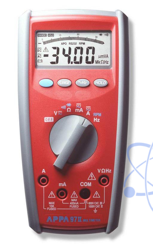 Мультиметры цифровые APPA 97II (APPA Technology Corporation): Постоянное напряжение 300 мВ - 1000 В; Переменное напряжение 3 - 750 В; Постоянный/переменный ток 30 мкА - 10 А; Сопротивление 300 Ом - 30 МОм; Частота 3 Гц - 30 МГц; Удержание показаний; Линейная шкала; Подсветка; Испытание p-n; Прозвон цепи; Частота вращения.