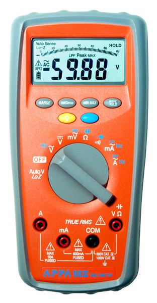 Портативные мультиметры APPA 98III, APPA 99III (с индексом «III») представляют собой результат дальнейшего развития и совершенствования мультиметров APPA серии 90. Как следует из наименования это уже 3 поколение серии. Функциональность новых моделей включает 8 режимов измерений: переменное (АС, AC+DC) и постоянное напряжение (до 1000 В), переменный и постоянный ток (до 10 А), температура (только АРРА 99III), частота (напряжения и тока), ёмкость, сопротивление, проверка целостности цепи (прозвонка) и испытание p-n переходов.