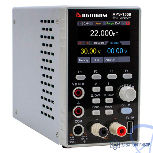 Источник питания APS-1509 построен по импульсной схеме стабилизации, благодаря чему имеет компактные размеры и небольшой вес. Прибор имеет встроенная функцию защиты по напряжению и току с заданием предельных параметров пользователем, функцию мониторинга выходных параметров и режим работы по списку с автоматическим запуском. Отличительной особенностью источника питания APS-1509 является наличие в этом же корпусе встроенного 41/2 - разрядного мультиметра с возможностью измерения постоянного и переменного напряжения и тока, сопротивления, емкости, тестирования диодов и проверки целостности цепей.