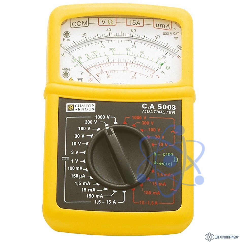 Прочный корпус с многофункциональной подставкой "Multistand" позволяет использовать мультиметр как на производственном участке, так и в лаборатории. Диапазоны измерения тока защищены плавкими предохранителями с высокой перегрузочной способностью, исправность которых показывает индикатор "Fus".В приборе СА 5003 обеспечена автоматическая установка нуля омметра. Во время измерения сопротивления или проводимости для предотвращения ошибочного подключения на индикаторе "Voltest" отображается присутствие внешнего напряжения в измеряемой цепи