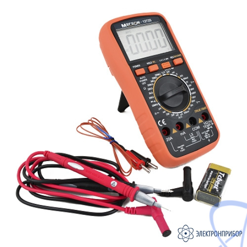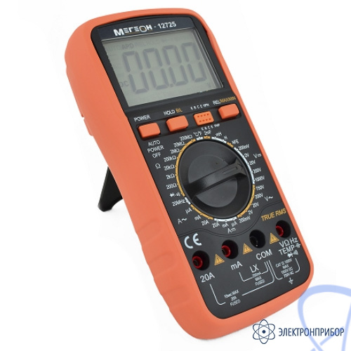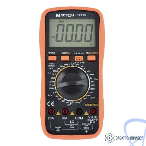 Надежный и высокоэффективный цифровой мультиметр МЕГЕОН 12725 (TrueRMS) предназначен для измерения переменного (True RMS) и постоянного напряжения, переменного (True RMS) и постоянного тока, сопротивления, емкости конденсаторов, индуктивности, частоты, температуры (шкала Цельсия/Фаренгейта), проверки диодов, проверки транзисторов и прозвонки соединений. Для улучшения считывания показаний в приборе применен жидкокристаллический дисплей 3½ разряда, с высотой цифр 42 мм.