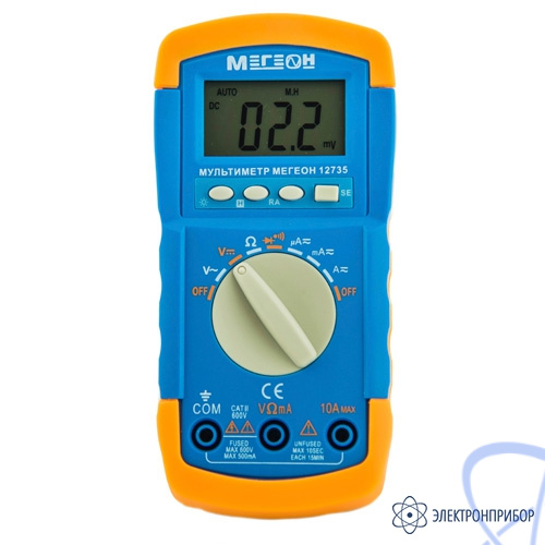 Недорогой цифровой мультиметр с автоматическим выбором диапазона МЕГЕОН 12735, это точный и надежной прибор, который будет радовать Вас своей долгой работой. В мультиметре реализована очень удобная функция автоматического выбора диапазона. Нет необходимости постоянно перещелкивать диапазоны, что ускоряет и упрощает процесс работы с прибором. Яркая подсветка дисплея позволяет использовать мультиметр в местах со слабым освещением. Компактный размер и малый вес цифрового мультитметра, позволяет его траспортировать и хранить без дополнительных сложностей. Мультиметр с автоматическим выбором диапазонавыполнен очень эргономично, прекрасно лежит в руке оператора. Прибор выполняет следующие виды измерений с автоматическим выбором диапазона: