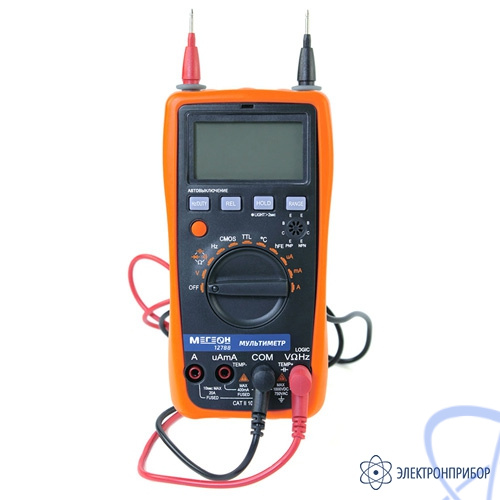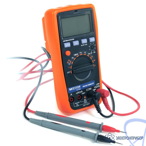 МЕГЕОН 12788 – это мультиметр из новой линейки многофункциональных измерительных приборов с автоматическим переключением диапазонов измерений. Мультиметр измеряет переменное и постоянное напряжение, переменный и постоянный ток, сопротивление, ёмкость, частоту, скважность, температуру, коэффициент передачи транзисторов, логический пробник, также функция проверки на обрыв (прозвонка) и диодный тест. Мультиметр оснащен подсветкой дисплея, а также функцией автоматического отключения.