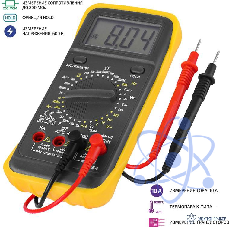 МЕГЕОН MY64 - это цифровой мультиметр с самым необходимым набором измеряемых параметров. Предназначен для применения в условиях лабораторий, обслуживания электрооборудования, бытового использования и сфере увлечений, радиотехники и несложного ремонта. Осуществляет измерения напряжения и силы постоянного и переменного токов, частоты, сопротивления, температуры и ёмкости.