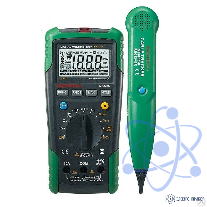 MS8236 это уникальный прибор сочетающий в себе функции цифрового мультиметра и кабельного тестера. В случае использования прибора как цифрового мультиметра он способен измерять постоянное и переменное напряжение до 600 Вольт, постоянный и переменный ток до 10 ампер, сопротивление до 20 Мегаом, а так же проверять диоды и проверять цепи на целостность.