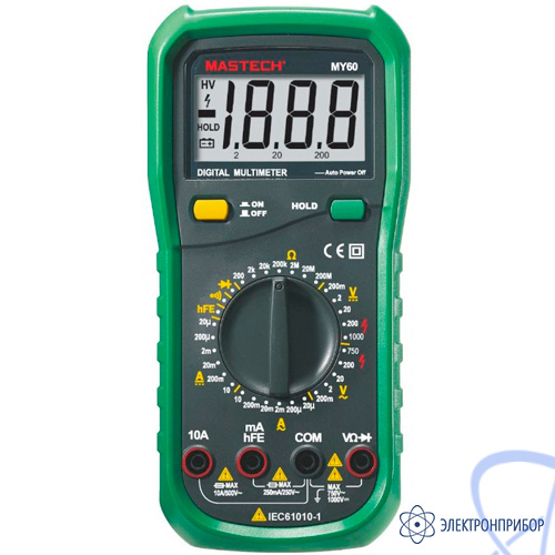 Цифровой мультиметр Mastech MY60 - младший представитель профессиональной серии серии мультиметров MY от Mastech - позволяет производить измерения величин силы постоянного и переменного тока, постоянного и переменного напряжения, сопротивления, коэффициента усиления биполярных транзисторов. Высокое входное сопротивление не вносит погрешности при измерениях величин и говорит о высокой точности прибора. Выбор пределов измерения величин производится вручную путем установки нужного положения многопозиционного переключателя.