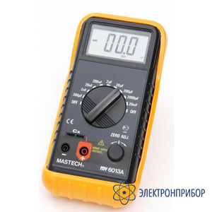 Цифровой измеритель ёмкости Mastech MY6013A позволяет измерять ёмкостные характеристики конденсаторов и участков электрических цепей. Он предназначен для измерения емкости с непосредственным выводом измеренного значения на 3½-разрядный ЖК-дисплей. Девять диапазонов позволяют точно измерять емкость от 0.1 пФ до 20 мФ практически любых конденсаторов, применяемых в электронике, в разрабатывающих лабораториях, на производстве, в сервисных центрах и школах. Батарейное питание, малый вес и размеры действительно позволяют отнести данный прибор к портативным измерительным устройствам.