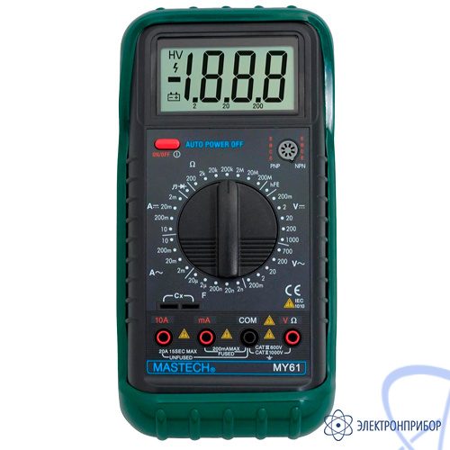 Цифровой мультиметр Mastech MY-61 измеряет величины силы постоянного и переменного тока, постоянного и переменного напряжения, сопротивления, коэффициента усиления биполярных транзисторов и ёмкости конденсаторов. Высокое входное сопротивление не вносит погрешности при измерениях величин и говорит о высокой точности прибора. Выбор пределов измерения величин производится вручную путем установки нужного положения многопозиционного переключателя.
