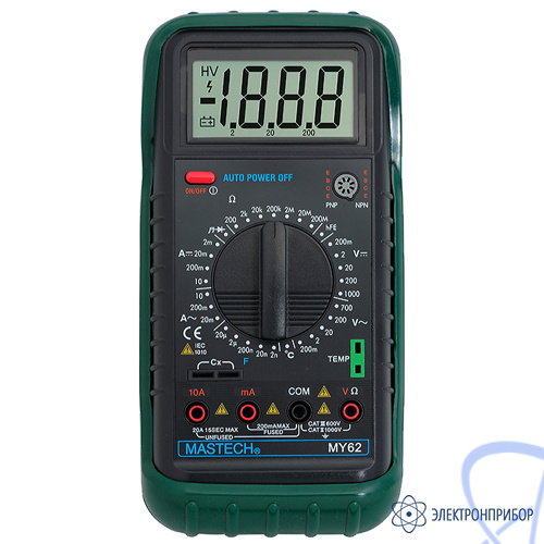 С помощью мультиметра MY-62 можно проверять полупроводниковые диоды и прозванивать электрические цепи. Результаты измерений выводятся на крупный цифровой 3 1/2 -разрядный ЖК-дисплей. Питание мультиметра осуществляется от одной батареи 9 В типа "Крона". Система автоматического отключения питания выключит прибор после примерно 40 минут его бездействия. Яркий и заметный защитный кожух из мягкого полимера, входящий в комплект поставки мультиметра Mastech MY-62, сохранит прибор от повреждения при падении или ударе. Рабочее положение измерительного прибора можно изменять с помощью упора на тыльной стороне корпуса.