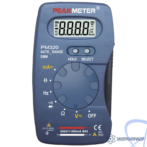 PM320 - компактный цифровой мультиметр предназначен для легкого, с высокой точностью измерения переменного и постоянного напряжения, переменного и постоянного тока, сопротивления, емкости и частоты, имеющий функции: проверка диодов и "прозвонка" цепей. Прибор оснащен функцией автовыключения питания для сохранения энергии батареи. PM320 автоматически перейдет в режим энергосбережения приблизительно через 15 мин.
