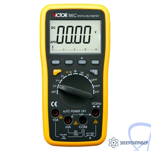 Victor 86C представляет собой высокоэффективный, высокоточный цифровой мультиметр с удобным, большим, легко читаемым жидкокристаллическим (ЖК) дисплеем (33/4 разряда, высота знака 30 мм). Позволяет измерять постоянное и переменное напряжение, постоянный и переменный ток, сопротивление, ёмкость конденсаторов, частоту, коэффициент заполнения периода и температуру, проверять диоды и производить "прозвонку" цепи.