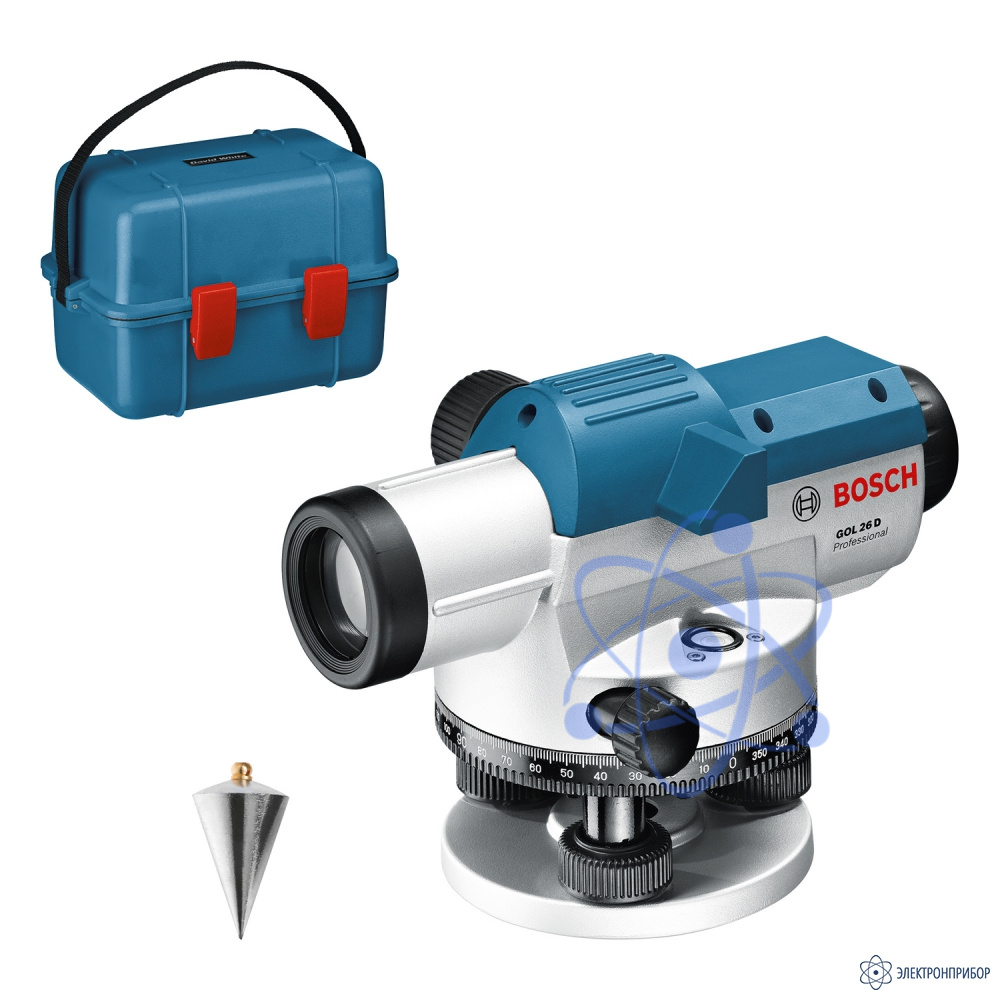 Bosch GOL 26 D Professional – это оптический нивелир, обеспечивающий отличную точность измерения превышений с погрешностью всего ±1.5 мм на 1 км двойного хода. Также прибор позволяет измерять расстояния по нитяному дальномеру и определять горизонтальные углы с помощью встроенного лимбом с точностью 0,5°. Точность измерений обеспечивается зрительной трубой с увеличением 26x, светосильным объективом и встроенным компенсатором. Устройство самовыравнивания обеспечивает выполнение работы при отклонении визирной оси от горизонта на ±15´. Тип демпфера компенсатора – магнитный. Изображение, передаваемое зрительной трубой – прямое, что облегчает работу. Дальность измерения этим нивелиром достигает 100 м.