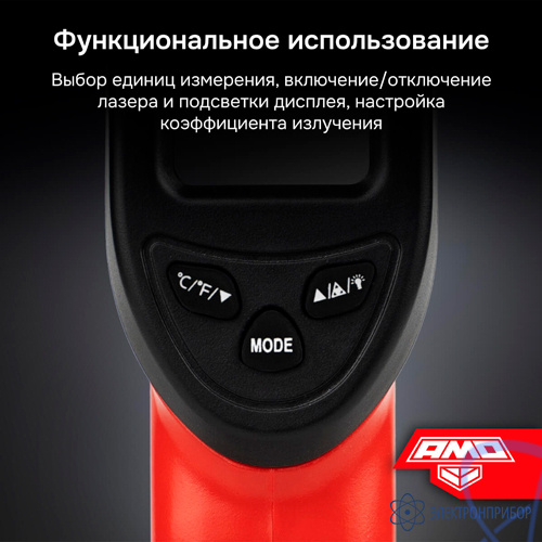 Кнопки управления, предназначенные для активации дополнительных функций, расположены под дисплеем – комфортно для нажатия большим пальцем руки, удерживающей пирометр за пистолетную рукоятку. С их помощью выполняется выбор размерности результатов измерений в °С или °F, включение и выключение подсветки экрана и лазерного излучателя, а также задание показателя EMS.