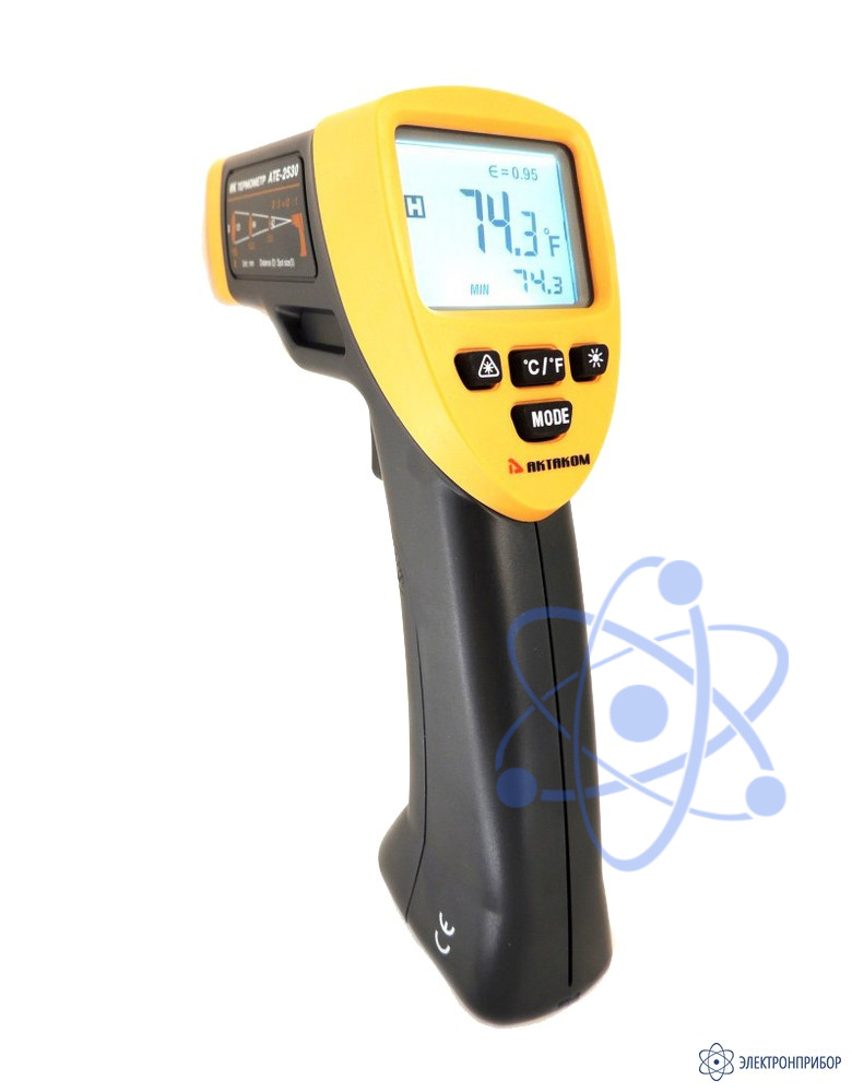 Инфракрасный термометр АТЕ-2530 предназначен для измерения температуры поверхностей пирометрическим способом. Пирометр АТЕ-2530 позволяет отображать на дисплее 2 температуры, сохранять в памяти максимальное, минимальное и среднее значение.