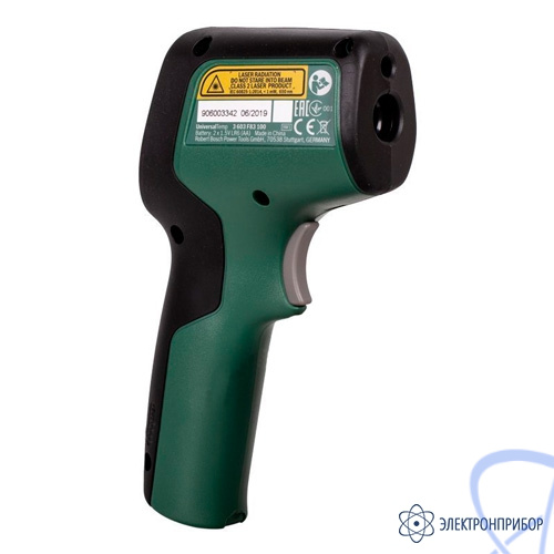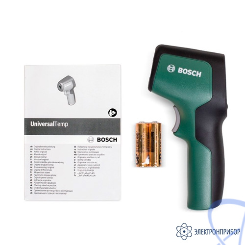 Разрешение оптики 12:1 позволяет проводить исследования с термодетектором на безопасном расстоянии от объекта. В качестве элементов питания служат обычные батареи типа “АА”, одного комплекта достаточно для 9 ч непрерывных замеров. За счет небольшой массы корпуса бесконтактного термометра Bosch UniversalTemp удобен при проведении длительных инспекций.