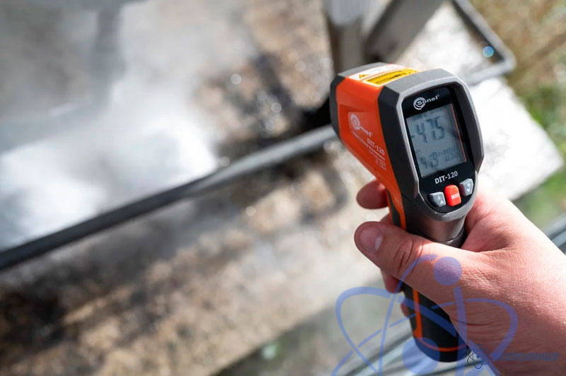 DIT-120 – инфракрасный измеритель температуры (пирометр). Современный прибор, позволяющий бесконтактным методом измерить температуру поверхности любых объектов: электронные компоненты, пластик, металл, дорожные покрытия, пластик, дерево, легко воспламеняемые объекты.