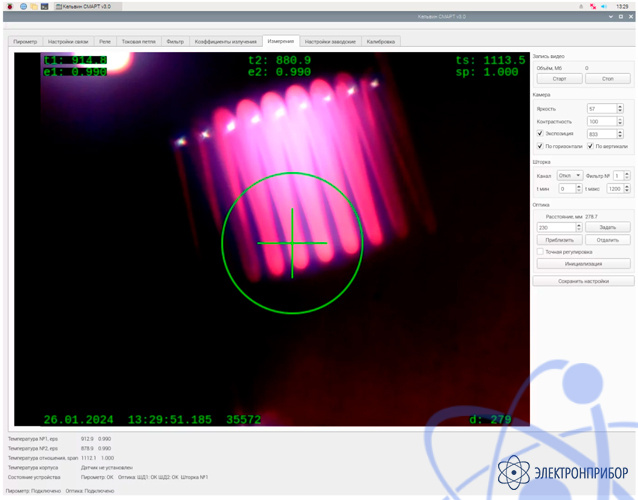 Информация получаемая с пирометра и видеокамеры синхронизируется с точностью до одного кадра и отображается в виде текстовой телеметрической информации, где на каждом её кадре присутствуют: температура по каждому из каналов, текущее значение епсилон и спан, дата и время с точностью до миллисекунды, расстояние до объекта и идентификатор измерения. Также изображение содержит метку соответствующую полю зрения пирометра.