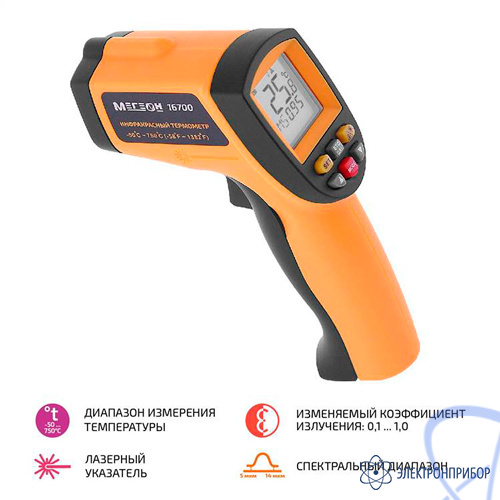 Компактный ИК-термометр-пирометр МЕГЕОН 16700 предназначен для точного измерения температуры поверхности различных предметов. Данный термометр позволяет производить измерения без контакта с исследуемым объектом. Это свойство широко используется в тех случаях, когда необходимо измерить температуру движущегося, опасного или горячего объекта, в труднодоступном месте или удалённого объекта. Благодаря эргономичному корпусу и удобному расположению элементов управления, пользоваться пирометром МЕГЕОН 16700 очень просто. Прибор оснащен функцией автоматического отключения при длительном простое. Также стоит отметить, что данный пирометр использует эффективную схему питания, которая позволяет длительное время осуществлять измерения без замены элемента питания.