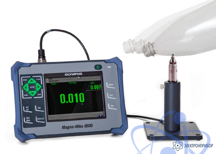 Magna-Mike 8600 представляет собой портативный толщиномер, использующий простой магнитный метод для высокоточного измерения толщины немагнитных материалов. Процедура измерения толщины очень проста. Измерения производятся с помощью магнитного преобразователя, расположенного с одной стороны контролируемого изделия, и стального шарика (диска или проволоки) – с другой стороны изделия или внутри емкости. Датчик на эффекте Холла измеряет расстояние от наконечника преобразователя до шарика. Результаты измерений немедленно отображаются на экране толщиномера.