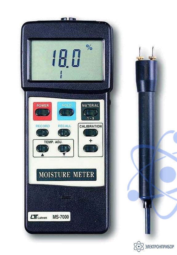 Прибор MS-7000 предназначен для определения содержания влаги в древесине. Он способен определить наличие влаги в диапазоне от 9% до 30%. Встроенный справочник о 150 породах деревьев и древесностружечной плите. В приборе имеется встроенная функция автоматической настройки, ручная настройка для температур от 0 до 50 °С.. В приборе имеется режим записи и вызова из памяти максимального, минимального значений, а также режим удержания показаний. Выносной датчик влажности позволяет проводить измерения на расстоянии. Интерфейс RS-232 позволит установить связь с компьютером. Прибор работает от батареи 9 В типа «Крона»; для продления срока службы батареи имеется функция автоматического выключения прибора. Кроме того, имеется сигнализатор разряда батареи.