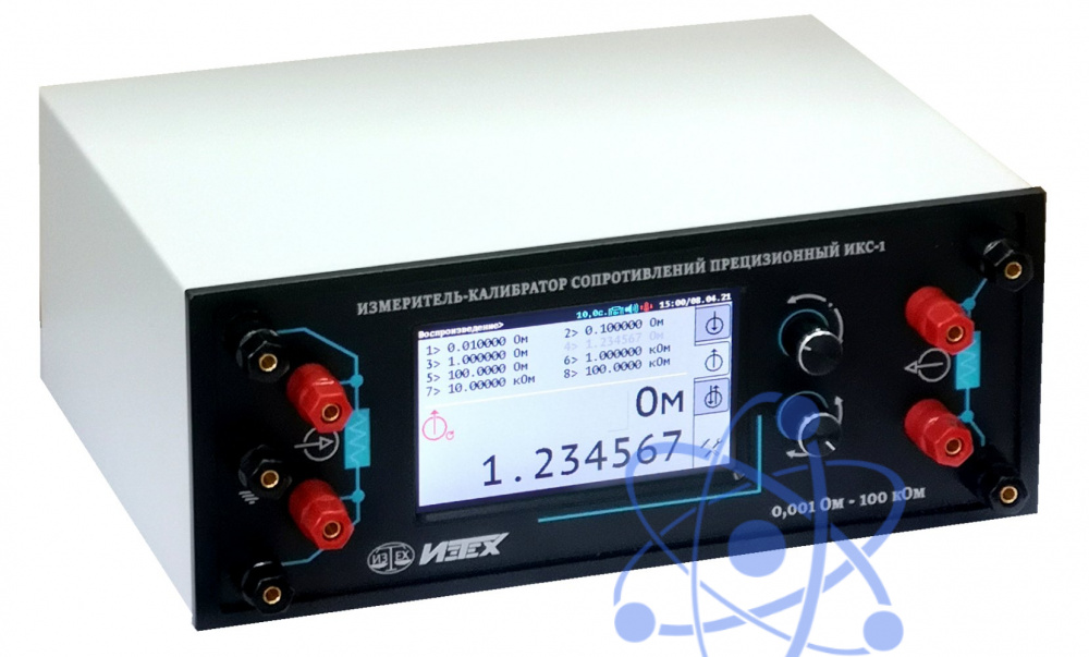 Прибор обладает широким диапазоном измеряемых и воспроизводимых значений электрического сопротивления - от 0.001 Ом до 100 кОм и недостижимой для классических магазинов сопротивлений разрешающей способностью - 1 µОм. Встроенный термостат опор позволяет обойтись без дополнительного термостатирования ИКС-1.