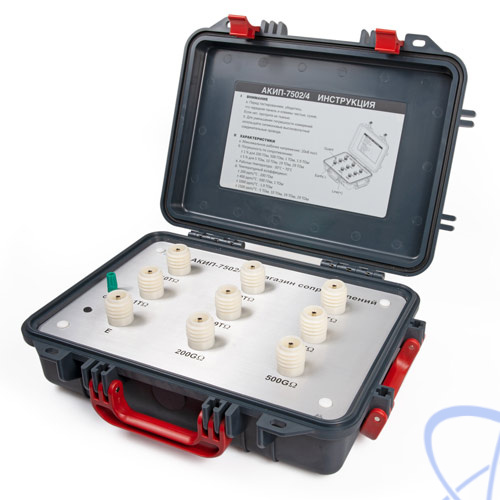Магазин сопротивлений АКИП-7502/4 представляет собой набор точных высокоомных высоковольтных резисторов. Конструктивно магазин размещен в переносном пластмассовом герметичном корпусе с откидной крышкой и ручками для переноски.