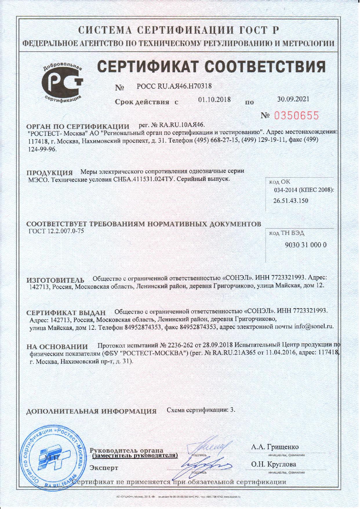 | 1 | Мера электрического сопротивления однозначная МЭСО-9Т-10кВ | 1 |
