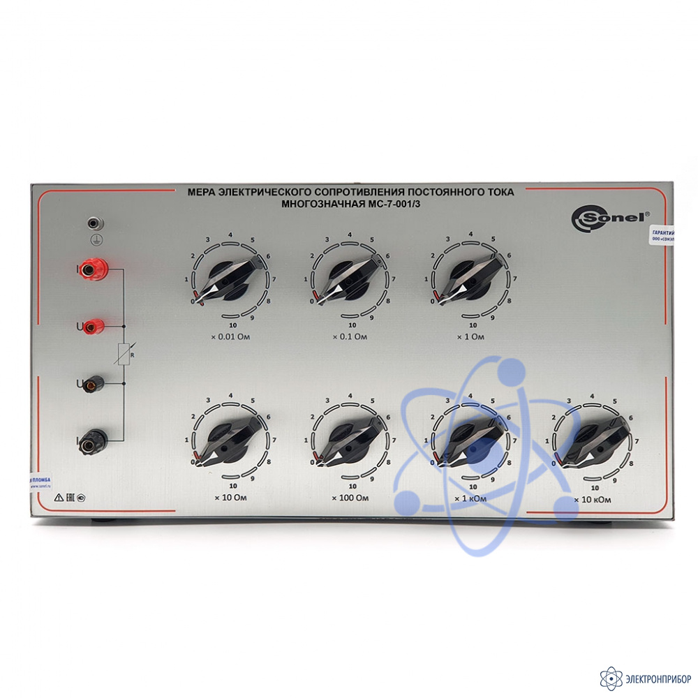 Меры серии МС-7-001 предназначены для воспроизведения электрического сопротивления в диапазоне от 0,01 до 111111,1 Ом. Меры представляют собой настольные лабораторные приборы, состоящие из 7 декад резисторов, соединяемых последовательно через поворотные переключатели ступеней декад. Каждая модель имеет три варианта исполнения, отличающихся между собой классом точности. Данные меры предназначены для использования в цепях постоянного тока.