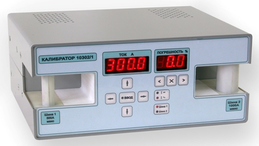 - Калибратор тока 10302 является точным источником тока, создаваемого в двух встроенных в прибор токоведущих шинах, и служит для поверки и калибровки бесконтактных измерителей тока (токоизмерительных клещей и датчиков тока, имеющих разъемный раскрыв). Рабочие участки токоведущих шин выведены на лицевую панель прибора и используются для охвата их раскрывом поверяемых (калибруемых) клещей - измерителей тока.