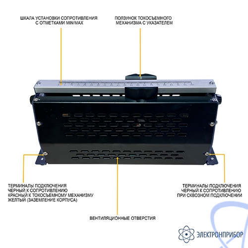 Сам реостат изготовлен в металлическом корпусе с перфорацией, которая служит защитой от токоведущих и нагревающихся элементов.