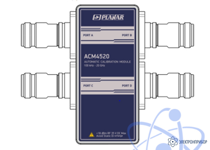 ACM4520-01111 - четырехпортовый автоматический калибровочный модуль с рабочим диапазоном частот 100 кГц - 18 ГГц и волновым сопротивлением 50 Ом, предназначенный для выполнения калибровки векторных анализаторов цепей (ВАЦ) в автоматическом режиме.