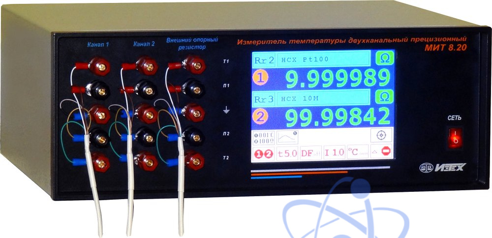 Прибор имеет два входных канала, которые могут измерять сигналы от разных типов датчиков температуры, а также активное сопротивление. При измерении температуры прибор сначала измеряет сопротивление ТС, а затем по введенным статическим характеристикам преобразования вычисляет температуру. Индивидуальные статические характеристики (ИСХ) эталонных термопреобразователей вводятся в МИТ 8.20 либо при помощи сенсорного дисплея, либо с персонального компьютера (программное обеспечение входит в комплект поставки). ИСХ ТС могут быть представлены в следующих форматах: МТШ-90, Калледдар-Ван Дюзен, полином девятой степени (T=C0+C1•R+C2•R2+.., где R – сопротивление ТС).