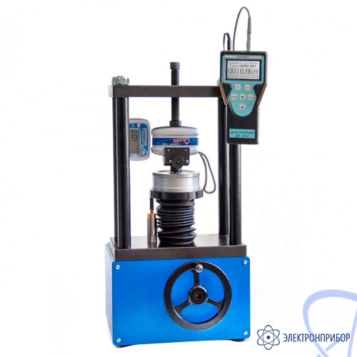 На основании силовой рамы смонтирован механизм нагружения с опорной плитой, представляющий собой винтовую передачу, и толкатель. Под основанием силовой рамы размещен привод механизма нагружения, представляющий собой редуктор с маховиком.