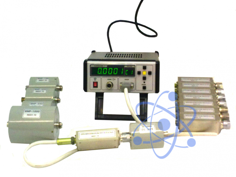 Комплект ПНТЭ-35 содержит набор модулей термоэлектрического преобразования напряжений, каждый из которых рассчитан на определенный диапазон уровней сигнала, а также измерительный блок ПНТЭ-35-00, который работает под управлением микропроцессора. Модули преобразования построены на основе пленочного термопреобразователя, содержащего подогреватель и многоэлементную термопару, выходное напряжение которой пропорционально мощности сигнала, рассеиваемой на подогревателе. Каждый из 7-ти модулей П1-П7, рассчитанных на небольшие уровни сигнала (до 45 В), выполнен в виде одного блока. Каждый из 5-ти модулей С1-С5, рассчитанных на повышенные уровни сигнала (в диапазоне от 25 до 1100 В), выполнен в виде двух составных блоков - блока масштабного резистора БМР, осуществляющего первичное преобразование напряжения сигнала в пропорциональное значение тока и блока ПТТЭ-35-0,7мА (модуль ПП), осуществляющего термоэлектрическое преобразование выходного тока блока БМР в постоянное напряжение. В блоке ПНТЭ-35-00 расположены цифровой микровольтметр и многозначная мера высокостабильного постоянного опорного напряжения программируемого уровня, воспроизводимого на выходе калибратора.