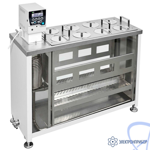 - Оригинальная конструкция блока регулирования температуры, объединяющая в одном замкнутом объеме датчик температуры, нагреватель и циркуляционный насос, позволяет добиться исключительной стабильности и равномерности температурного поля в рабочем объеме термостата.