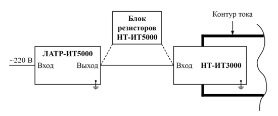 На Рис.1 приведена схема включения ИТ-3000. Регулятор напряжения ЛАТР-ИТ5000 подключается к сети переменного тока 220 В. Розетка «Выход» ЛАТР-ИТ5000 соединяется с вилкой «Вход» НТ-ИТ3000 кабелем «ЛАТР-НТ». Кабели «К-240», «К-120», «К-50», «К-16» используют в качестве внешней обмотки (контура тока). Их пропускают через отверстие на блоке НТ-ИТ3000 и подключают к первичным обмоткам измерительных ТТ. При работе на номинальных первичных токах 250, 200 и 150 А для поверки одно- и пятипроцентных значений тока измерительных ТТ между блоками ЛАТР-ИТ5000 и НТ-ИТ3000 необходимо включать Блок резисторов НТ-ИТ5000.