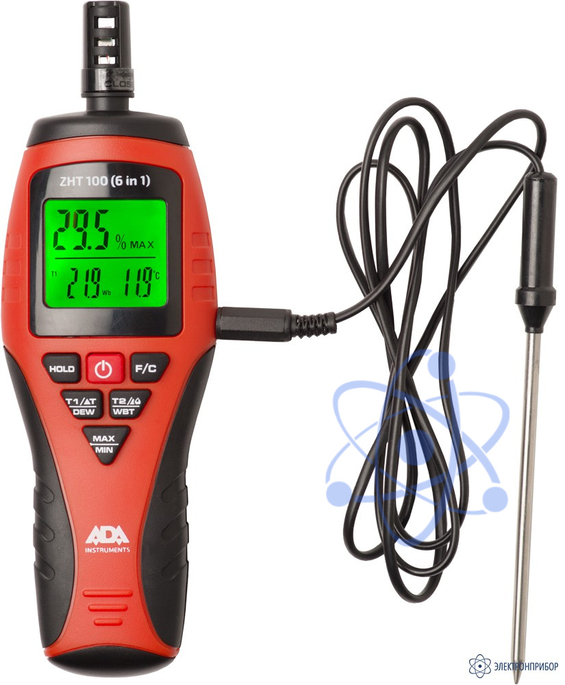 Измеритель влажности ADA ZHT 100 (6 in 1) оснащен датчиком, который применяется для измерения параметров внешней среды хранения и производственных складов. Прибор измеряет влажность окружающей среды и температуру, температуру влажного датчика и точку росы.