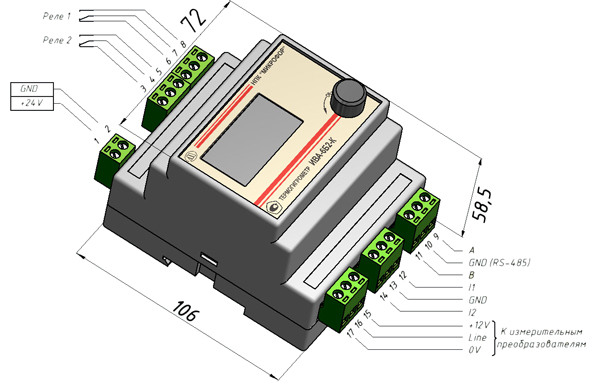 Рис. 1. Назначение контактов и габаритный размеры блока индикации термогигрометра ИВА-6Б2-К-DIN