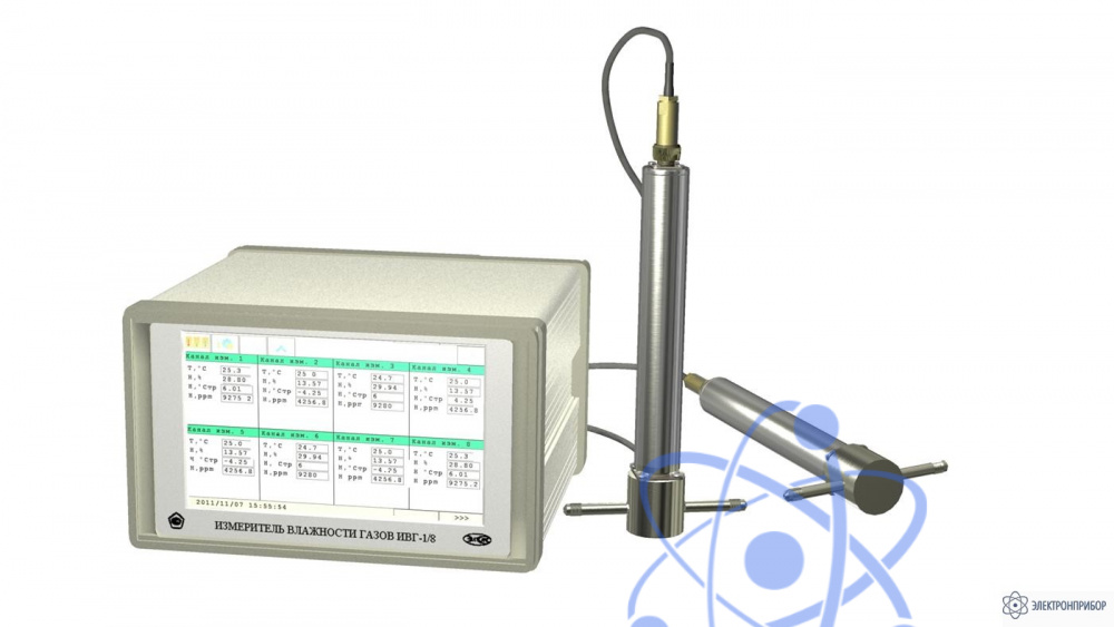 Гигрометр ИВГ-1/16-Т-8A-8Р представляет собой стационарный шестнадцатиканальный измеритель-регулятор микровлажности газов (электронный гигрометр) с сенсорным TFT дисплеем.