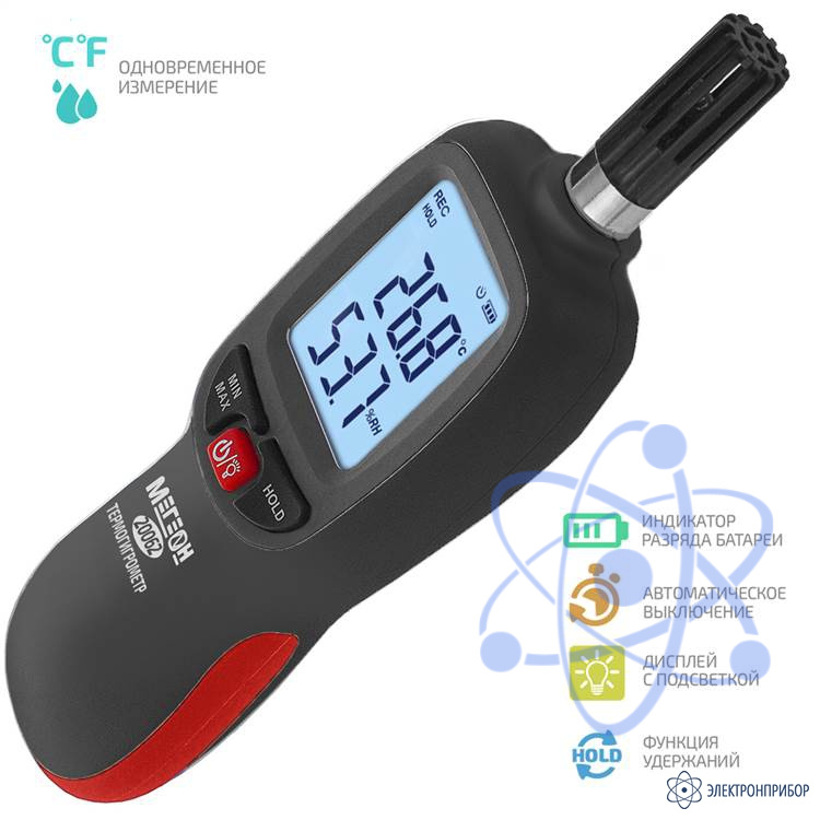 МЕГЕОН 20062 – новинка в модельном ряду цифровых высокочувствительных термогигрометров. Представленный прибор предназначен для быстрого определения параметров температуры и влажности с высокой точностью в помещениях и на открытом пространстве. Помимо этого с его помощью можно определить точку росы, снять показания влажного термометра, а также зафиксировать максимальные и минимальные значения измеренных данных.