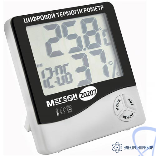 МЕГЕОН 20207 это настольный прибор для измерения температуры и влажности воздуха в помещении, кроме этого в прибор встроены часы (работающие в 12 или 24 часовом формате), будильник и отображение текущей даты, сохраняет в памяти минимальную и максимальную зафиксированную температуру и влажность.
