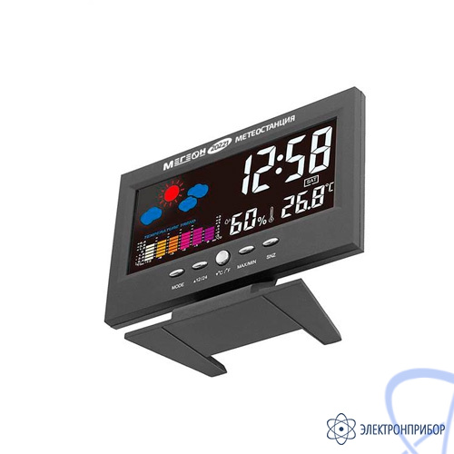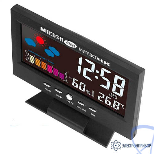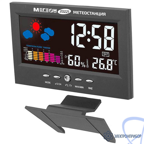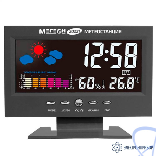 МЕГЕОН 20221 - новинка в модельном ряду термогигрометров для домашнего использования. Модель получила стильных внешний вид и яркий цветной ЖК-дисплей. Прибор одновременно показывает текущее время в 12 или 24 часовом формате, день недели, вычисляет минимальную и максимальную зафиксированные температуру и влажность. Одной из особенностей является наличие функции автоматической активации подсветки экрана при появлении постороннего звука. Метеостанция с успехом заменит будильник, а также предупредит о неблагоприятной обстановке в помещении. Применение современных комплектующих высокого качества позволило добиться низких показателей погрешности и увеличения скорости вычисления данных. Благодаря эргономичному дизайну и компактным размерам изделие идеально впишется в любой интерьер и займёт достойное место на тумбочке в спальне или на письменном столе.