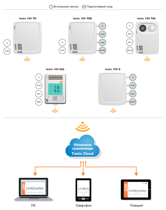 testo 160 – система логгеров для мониторинга температуры, влажности, освещённости, УФ-излучения, абсолютного давления и концентрации CO2.